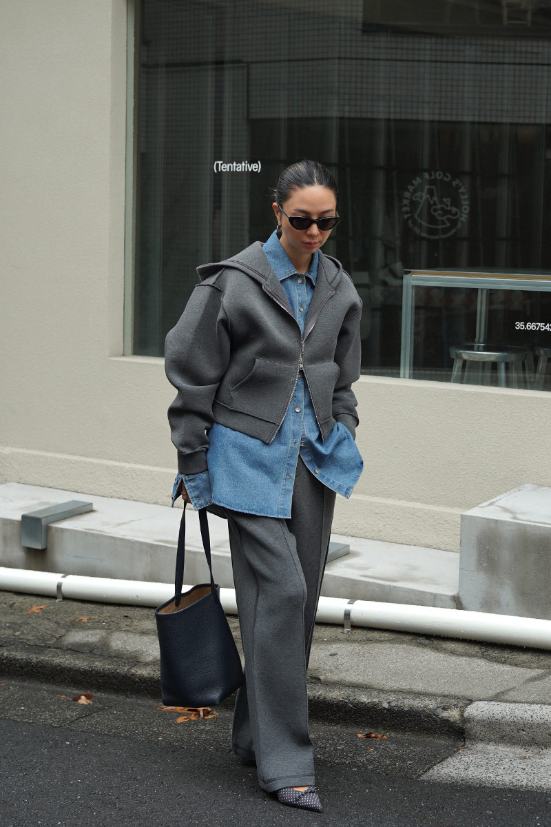 程よいハリ感が着るだけで立体的なシルエットを作り出しシンプルながら存在感のある一着。