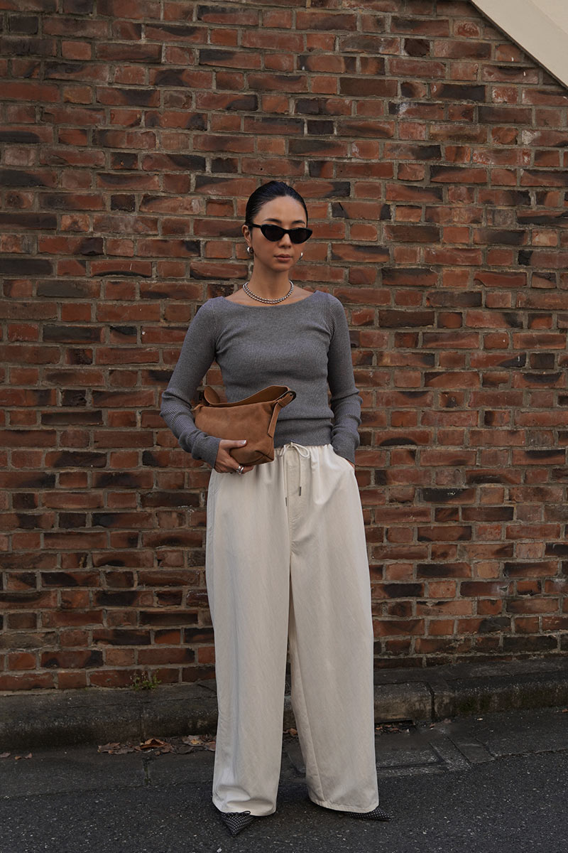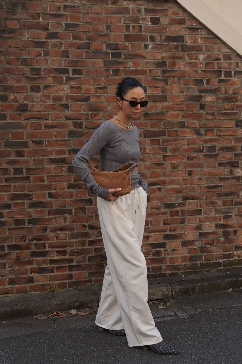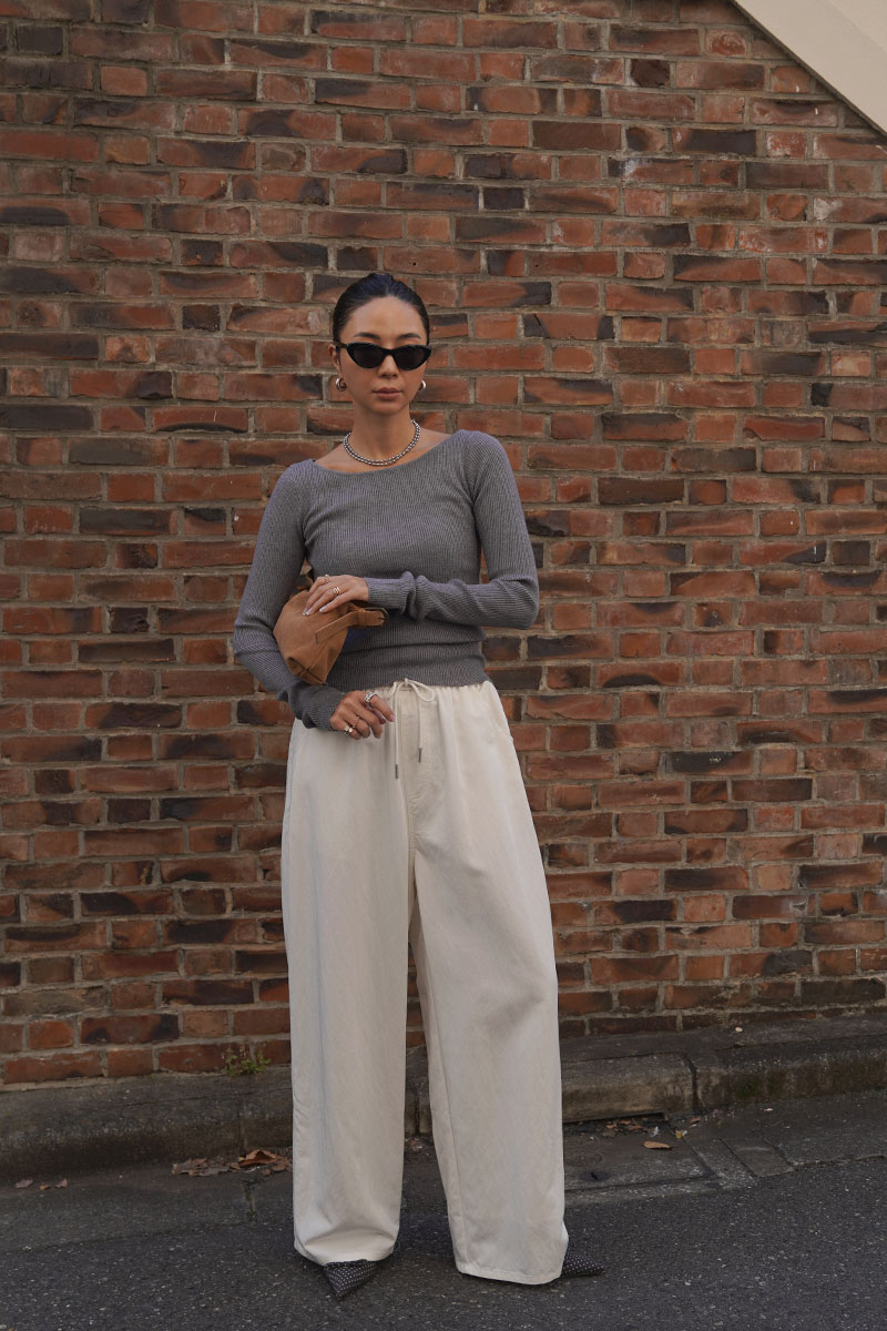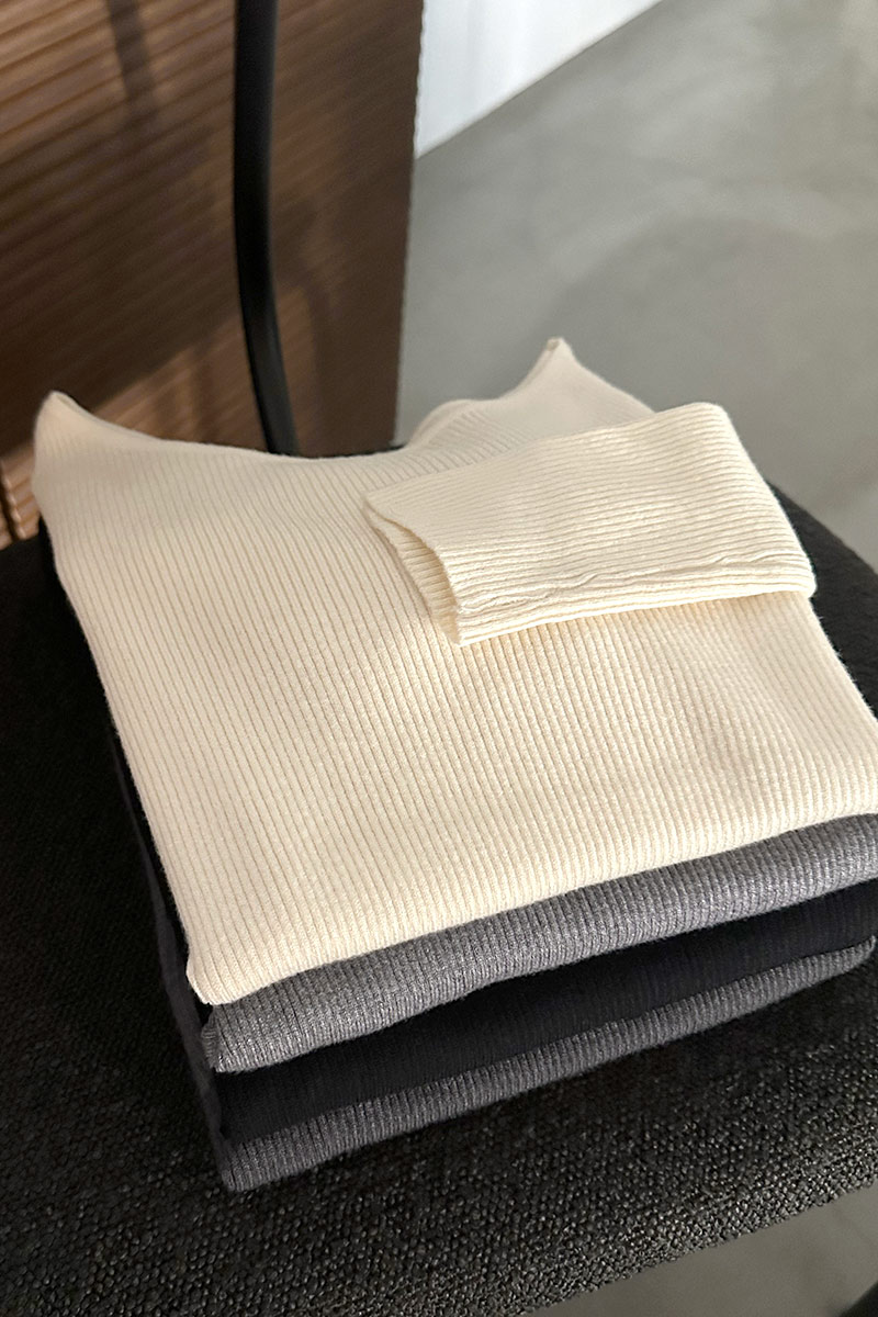 伸縮性のある細リブ生地が身体のラインに程よくフィットし上品なシルエットを演出。
