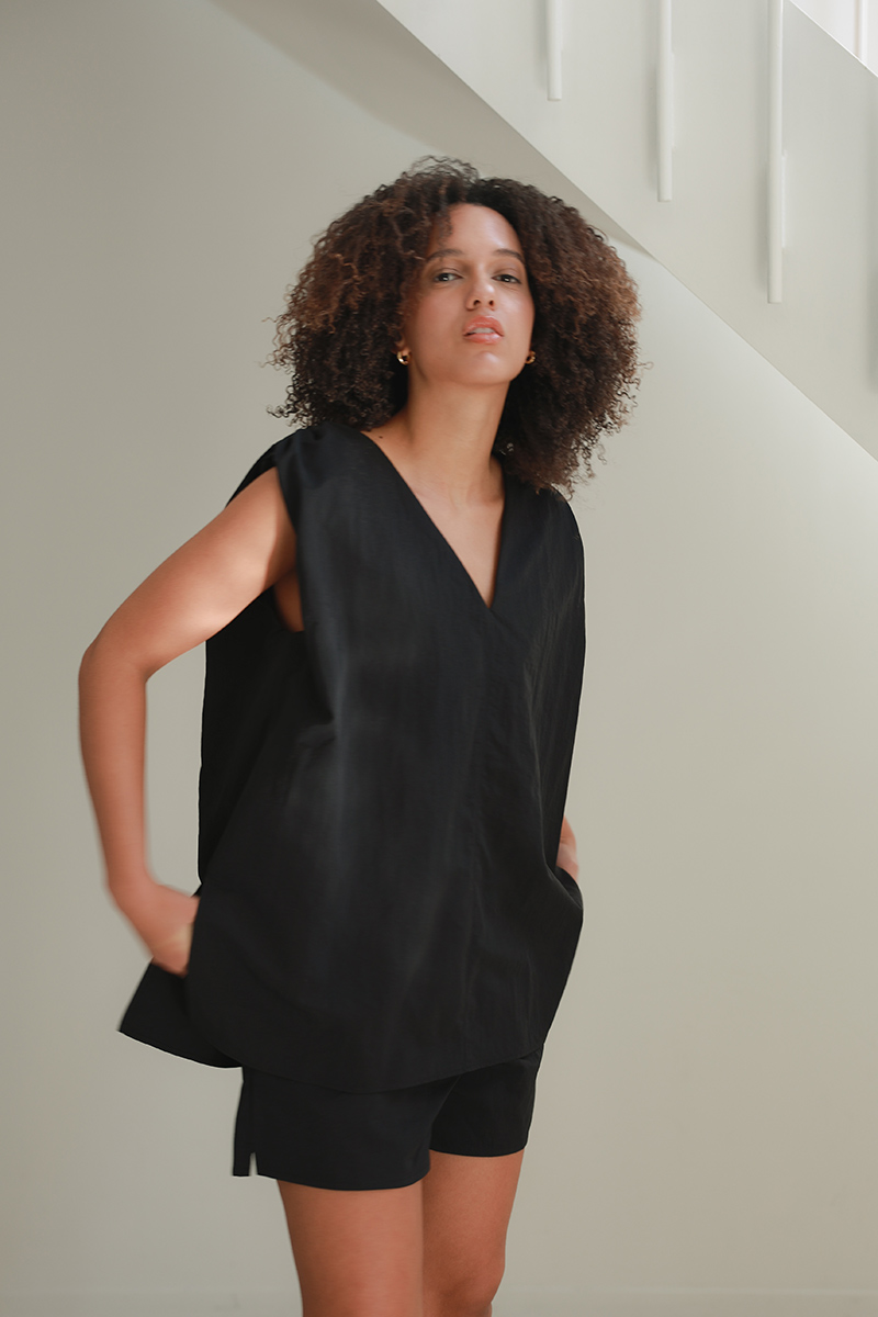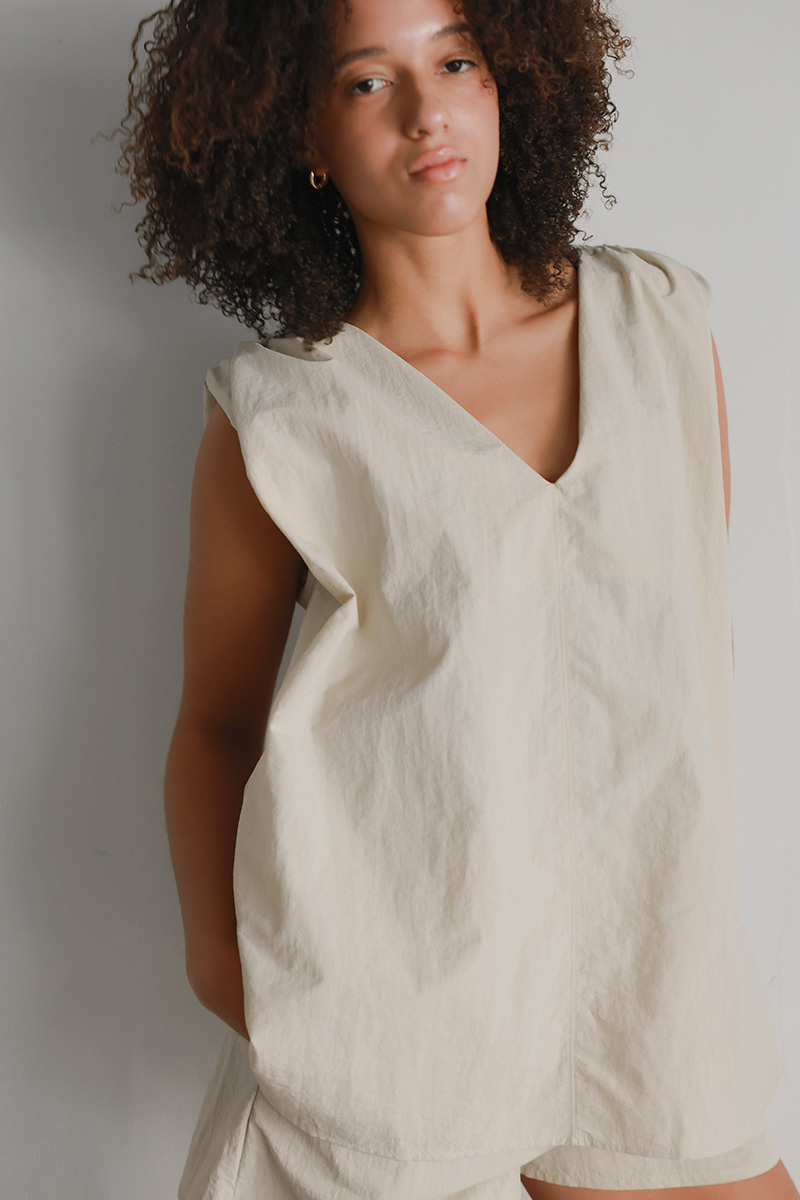 トップスはセンター切り替えラインにラウンドネックとVネックの前後2wayで着用可能。
