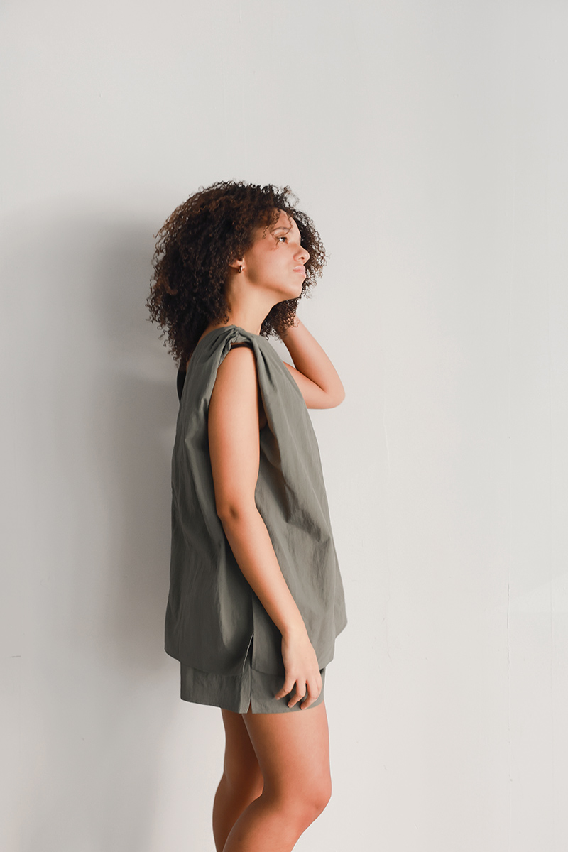 両サイドのタックデザインがボリュームや動きを出してくれ、程よいゆとりがあることでストレスフリーな1着。