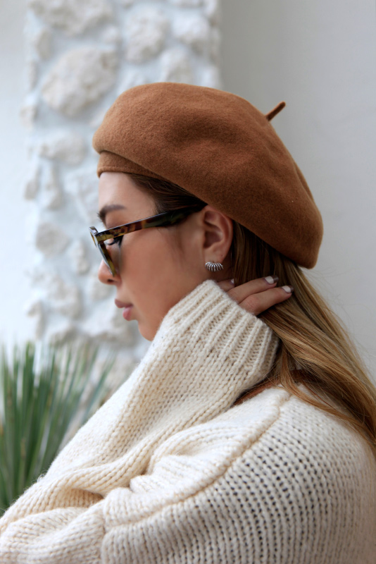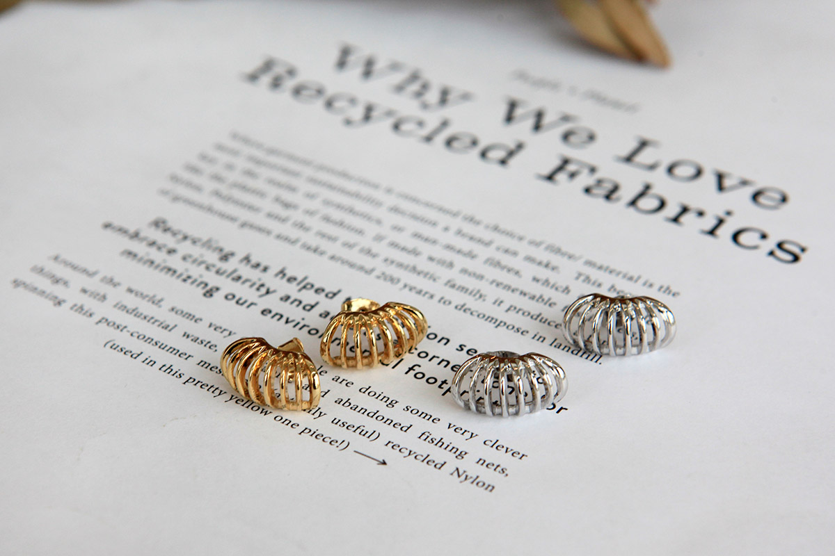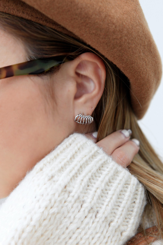 小ぶりですがデザイン性のあるピアスでコーディネートのポイントに。