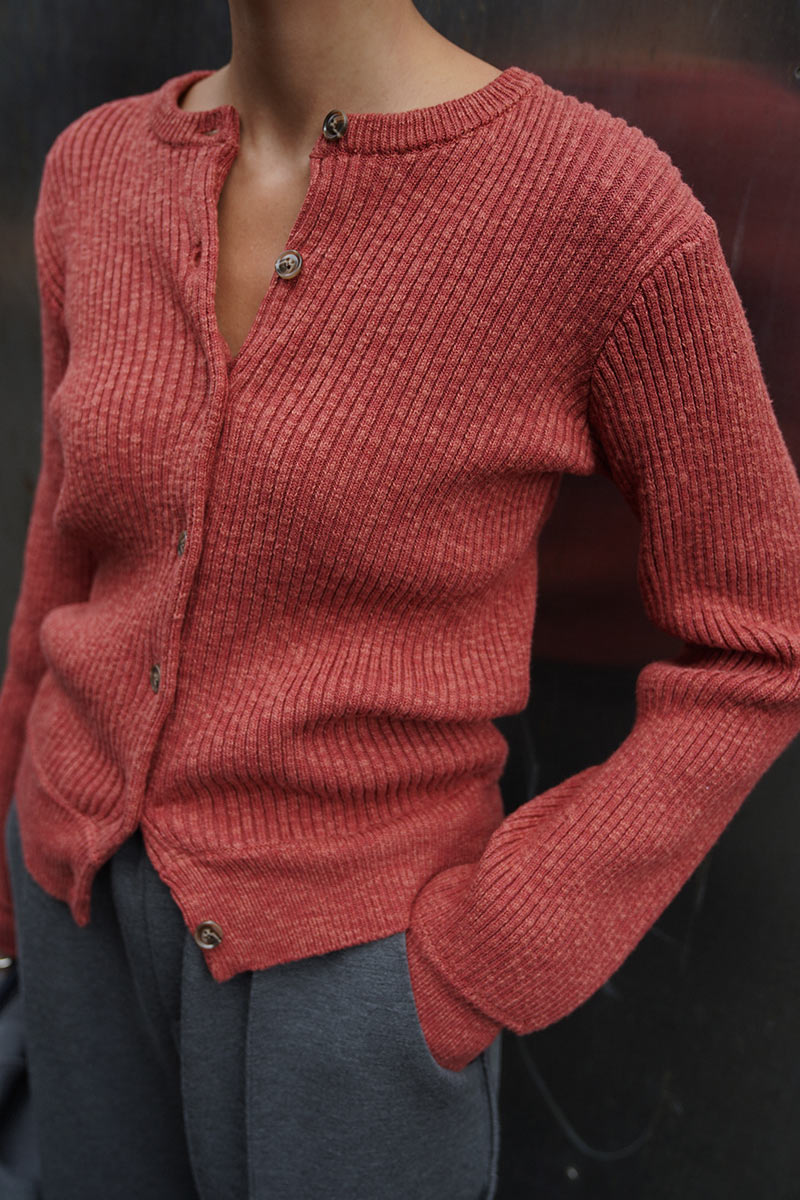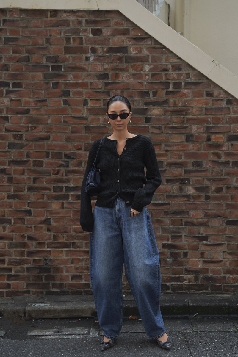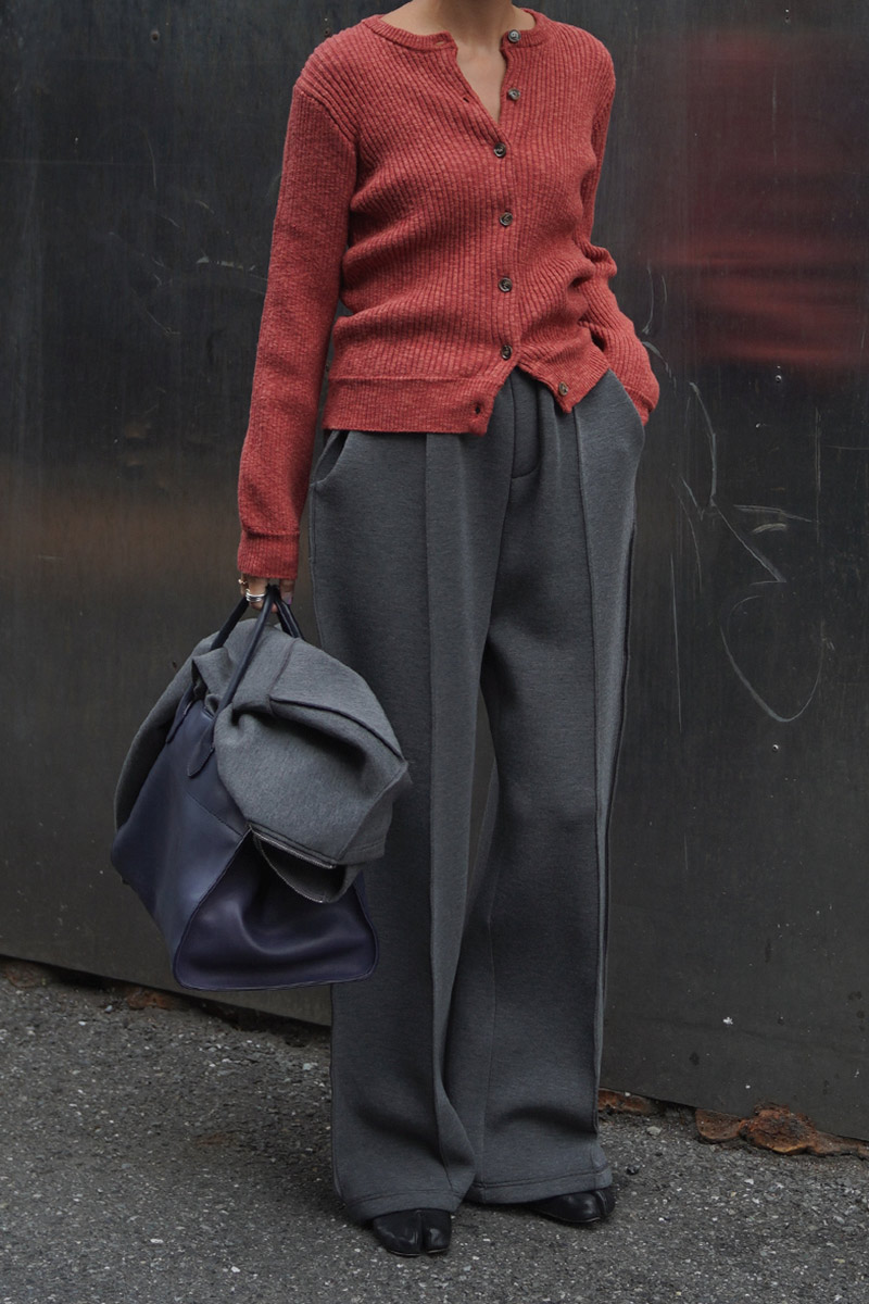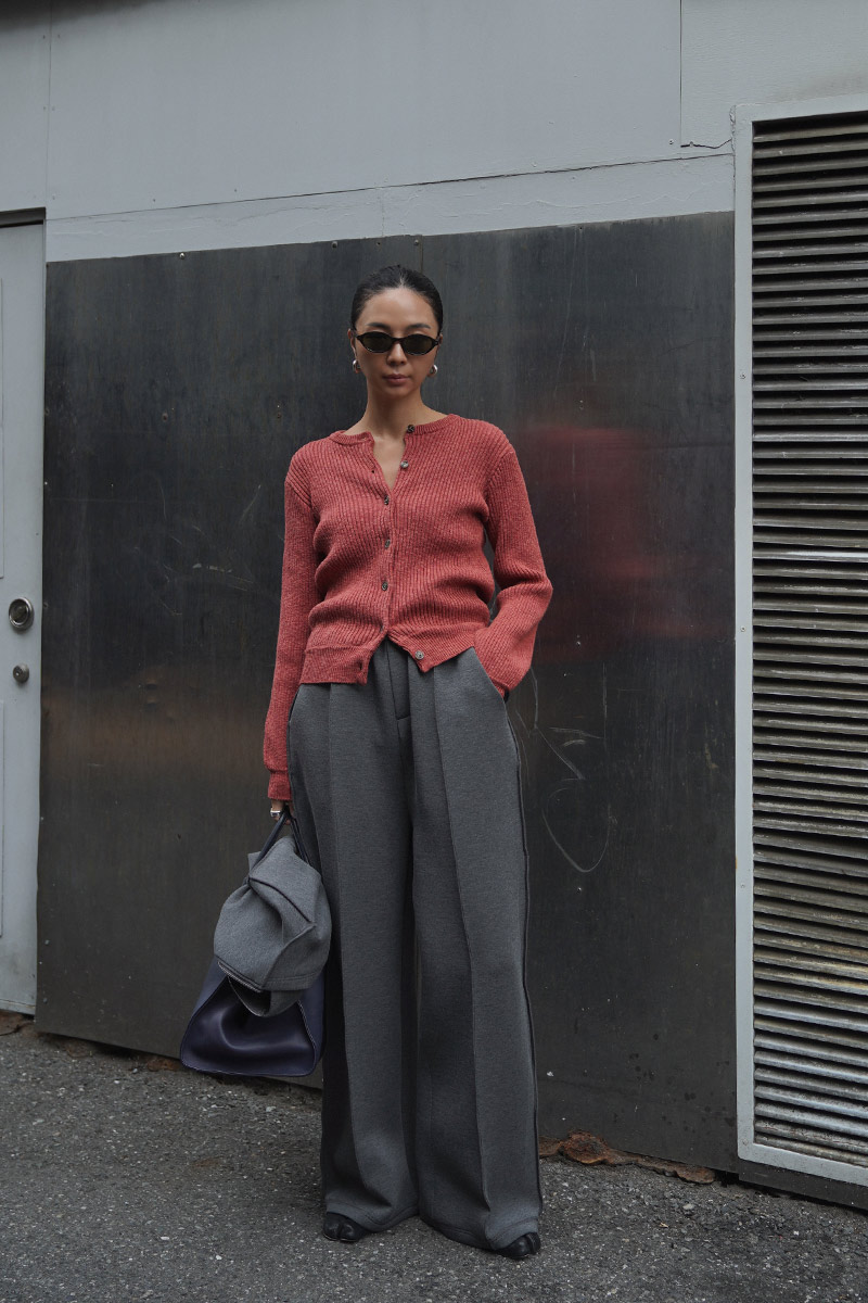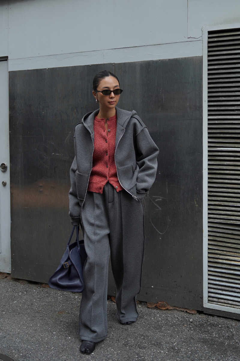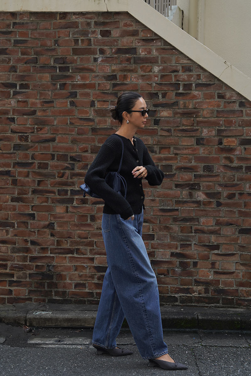 首元は詰まったラウンドネックでボタンは小さめのマーブルボタンがポイント。