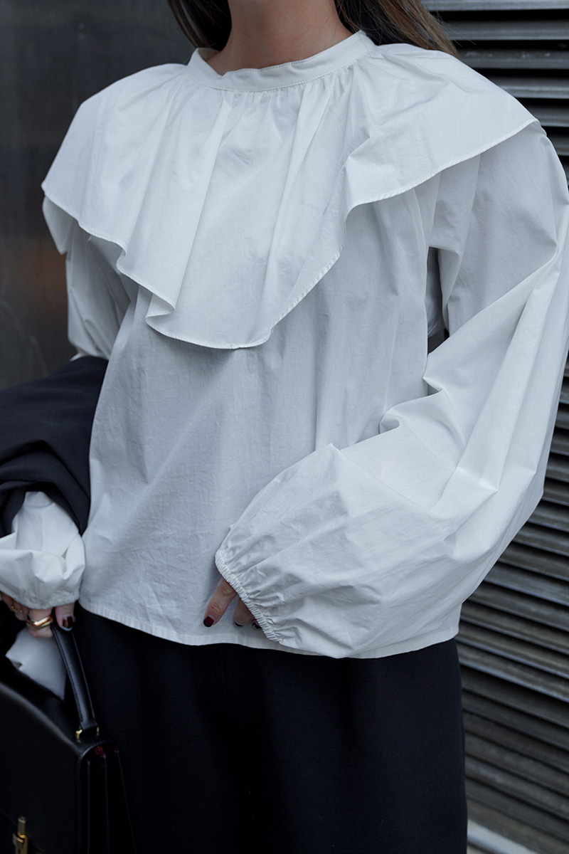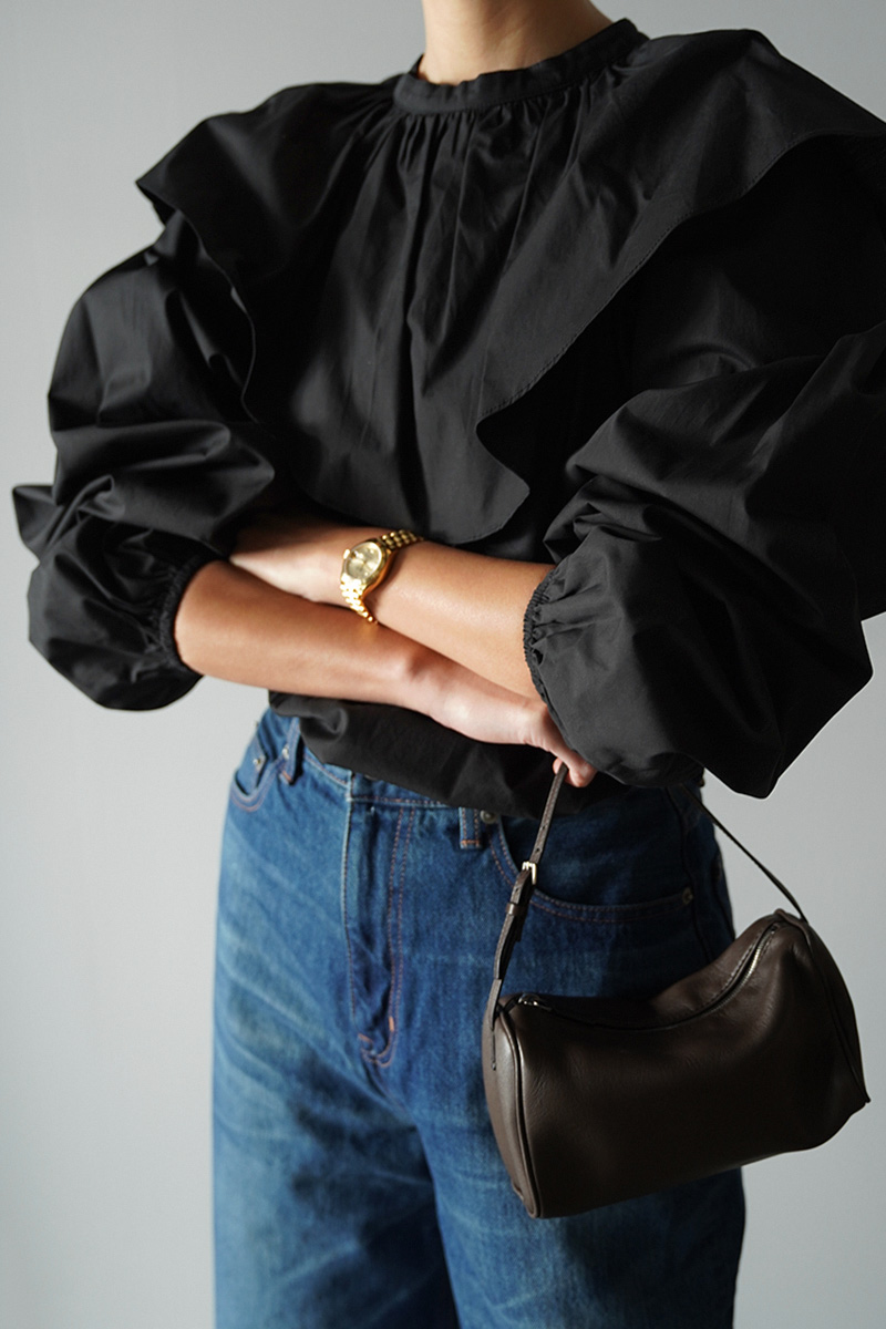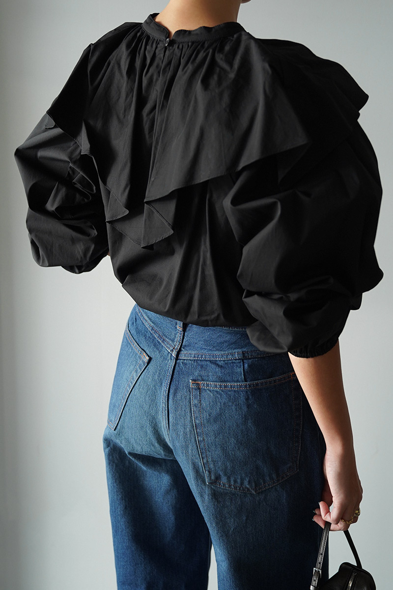 袖周り、襟部分のボリュームもあり、360度どの角度から見ても可愛いフォルムのブラウス。