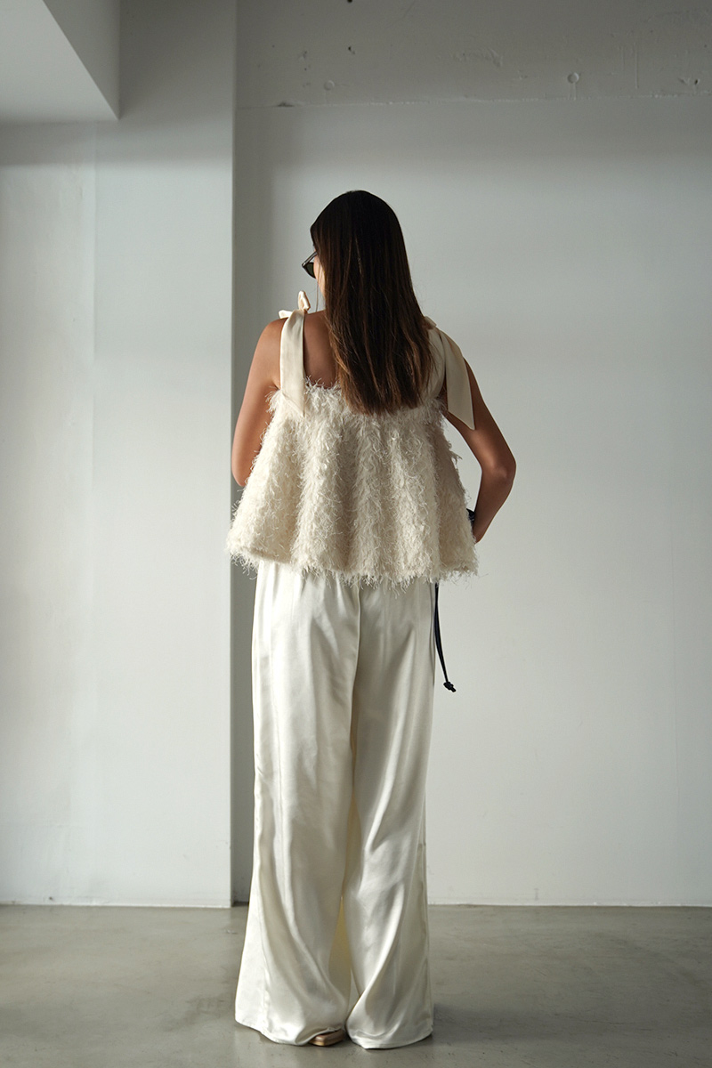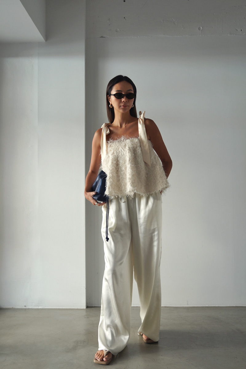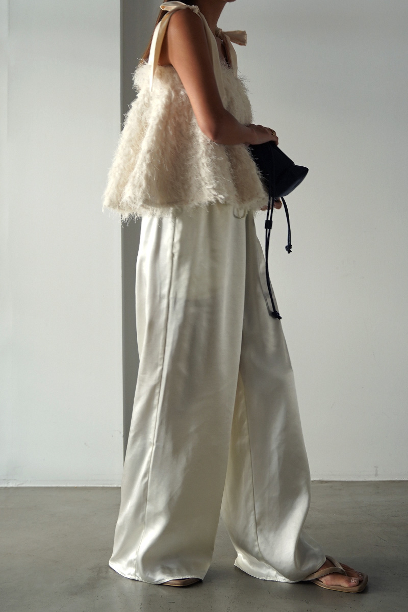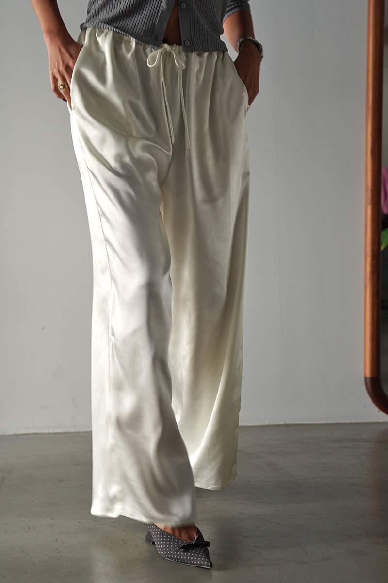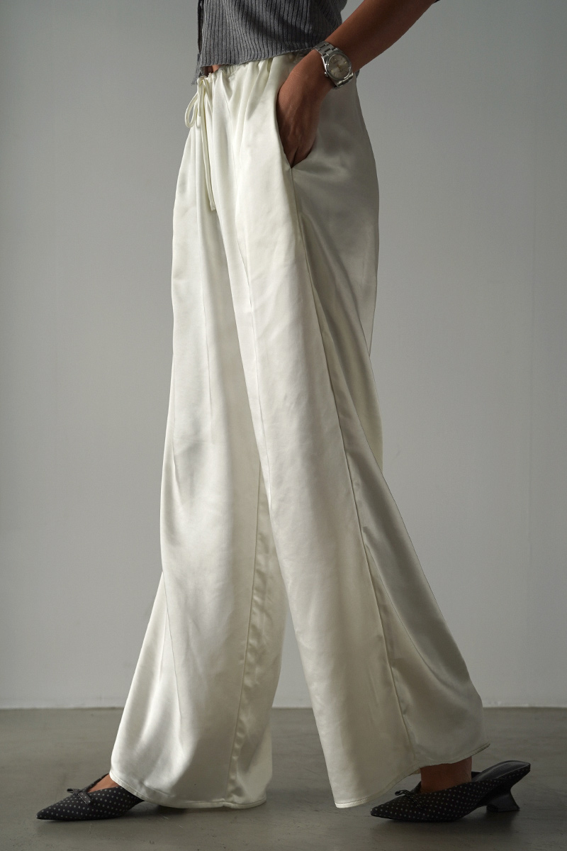 エレガントな雰囲気漂うサテンワイドパンツ。