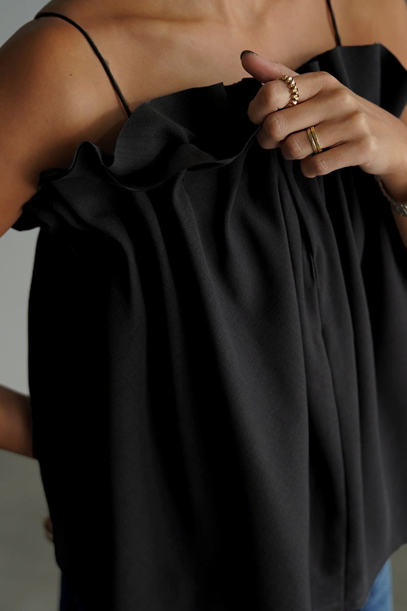 2枚重なる大ぶりなプリーツデザインがポイントのトップス。