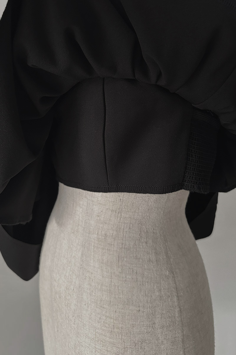 重ねた生地のプリーツを前側面に巻き寄せる特徴的なデザインに、着脱時に伸縮性がある裏地を使用しておりますため、仕様上、前側面に隙間がございます。