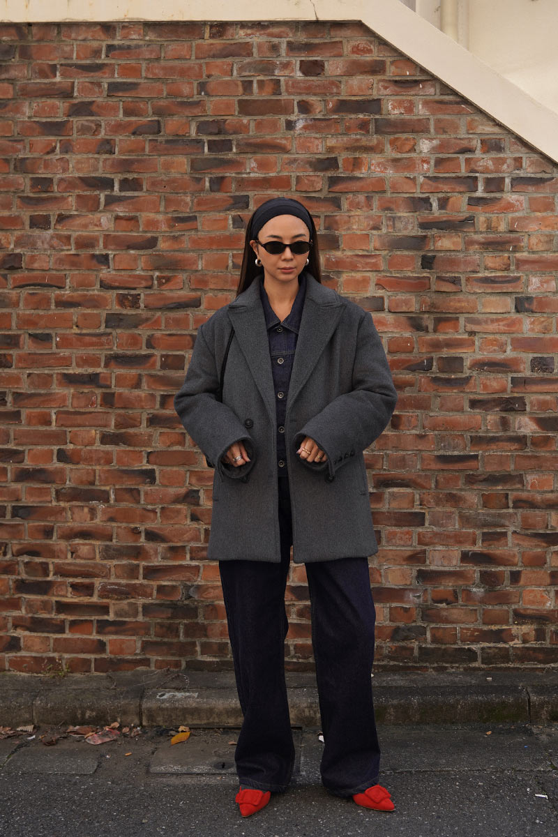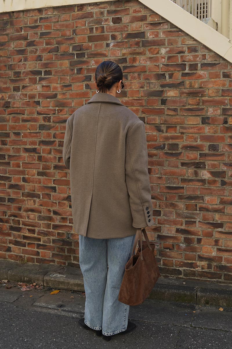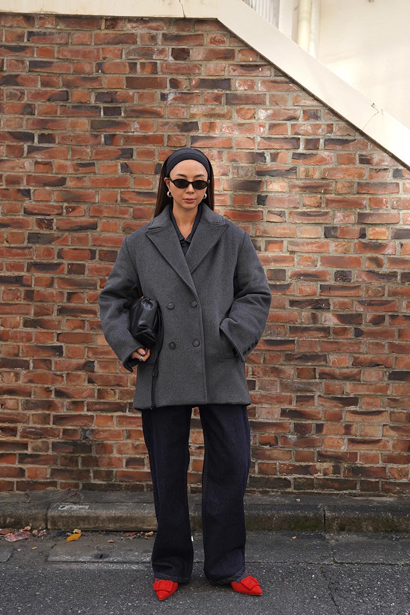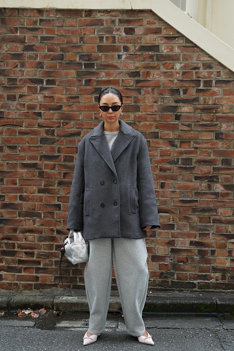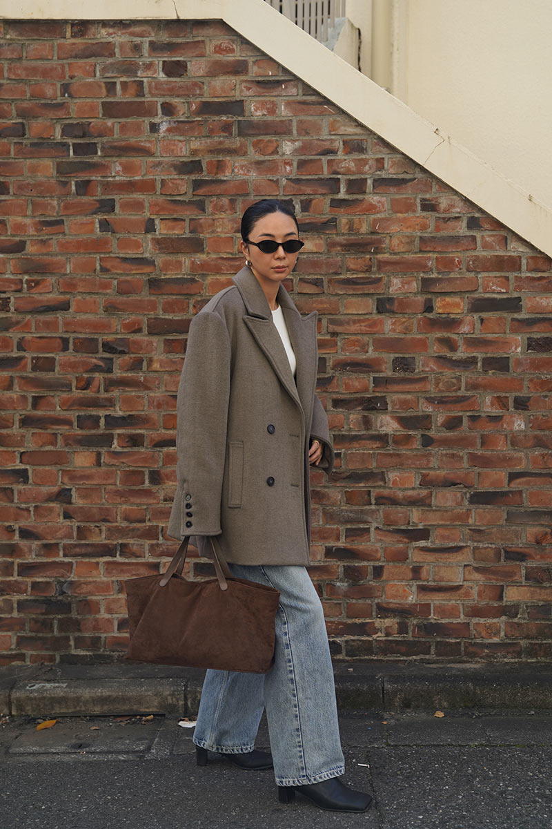 ざっくりと開いた首元はスッキリとした印象を与えるのはもちろん、タートルネックやカラーアイテムを入れインナーが映えるのもポイント。