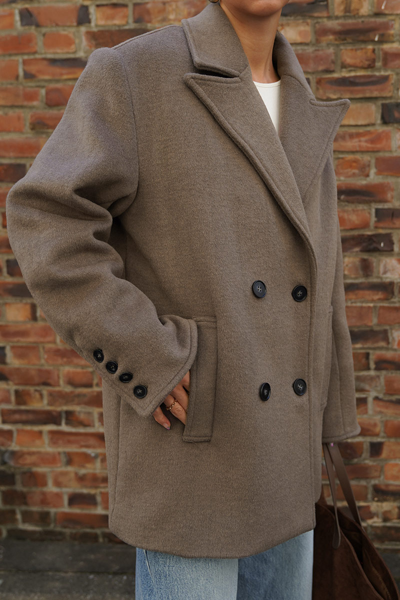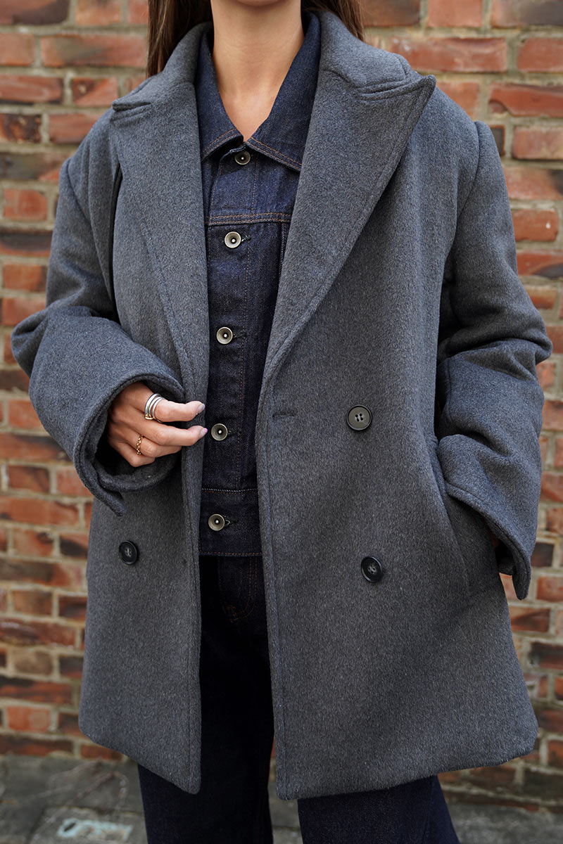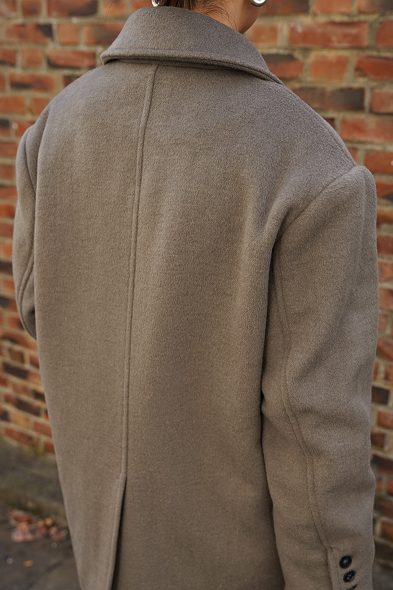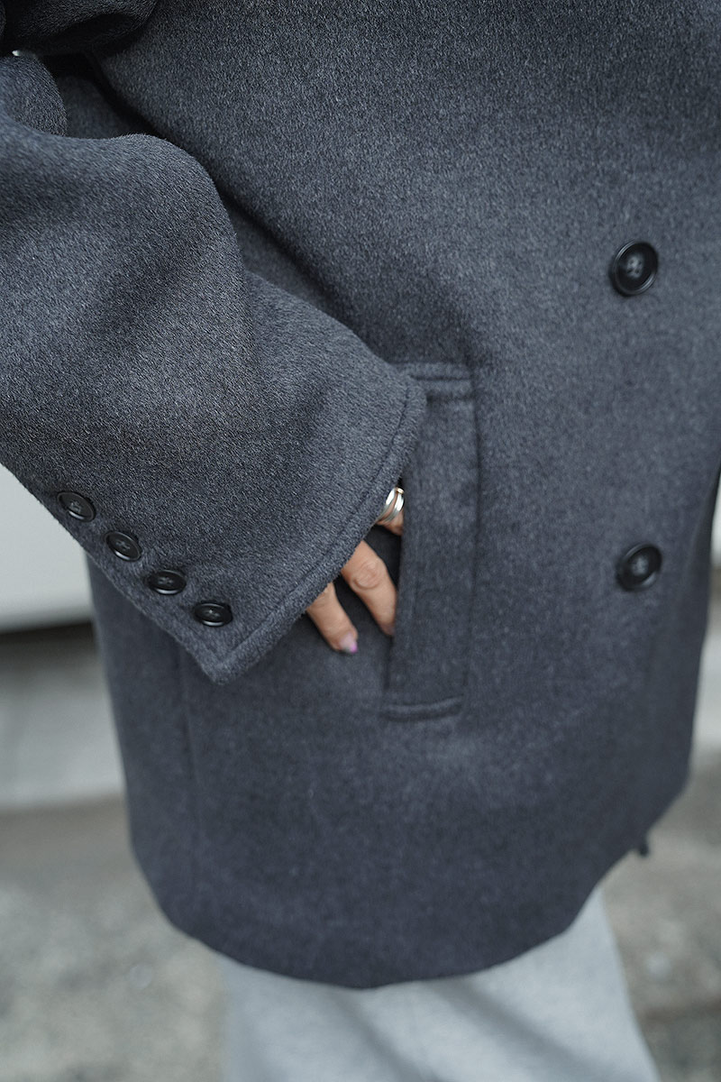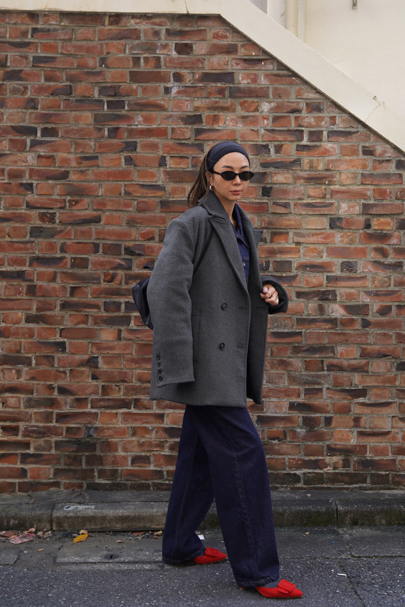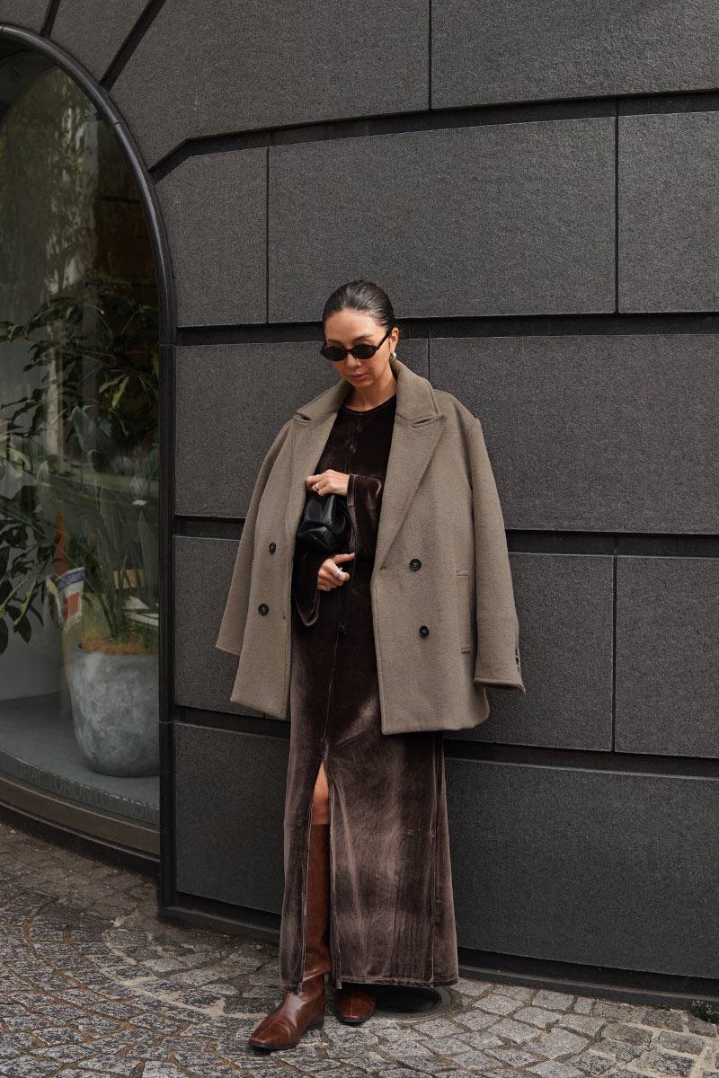 ざっくりと開いた首元はスッキリとした印象を与えるのはもちろん、タートルネックやカラーアイテムを入れインナーが映えるのもポイント。