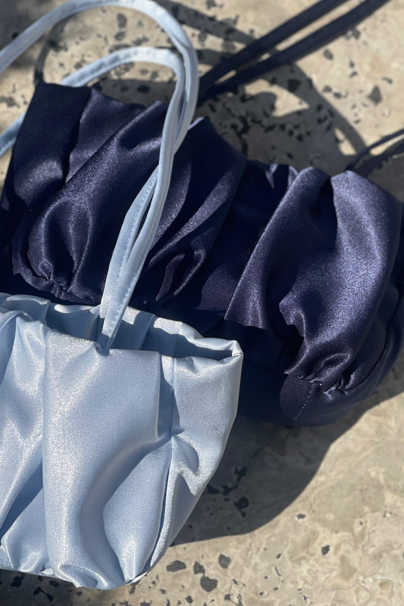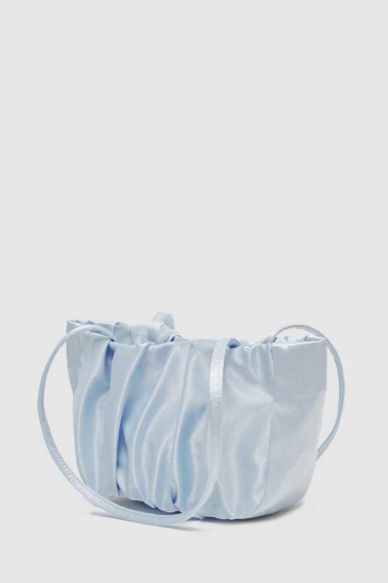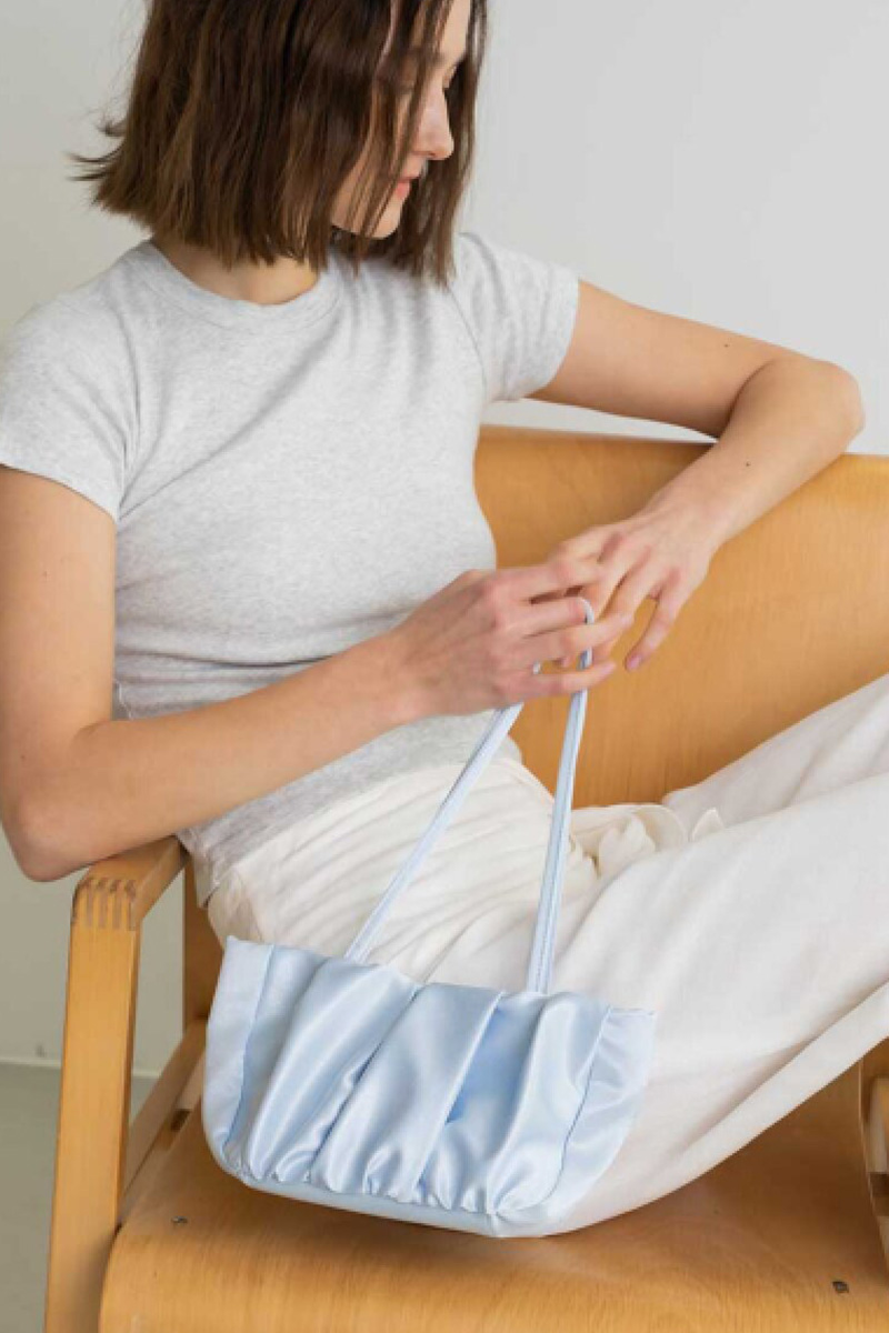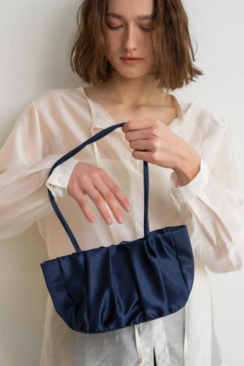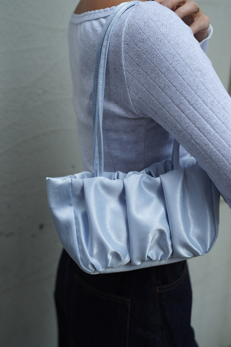 華奢な細めストラップは肩に掛けやすい長さで表面はたっぷりと寄せられたギャザーが立体的なシルエットを作り出し持つだけでコーディネートに華やかさをプラスしてくれます。
