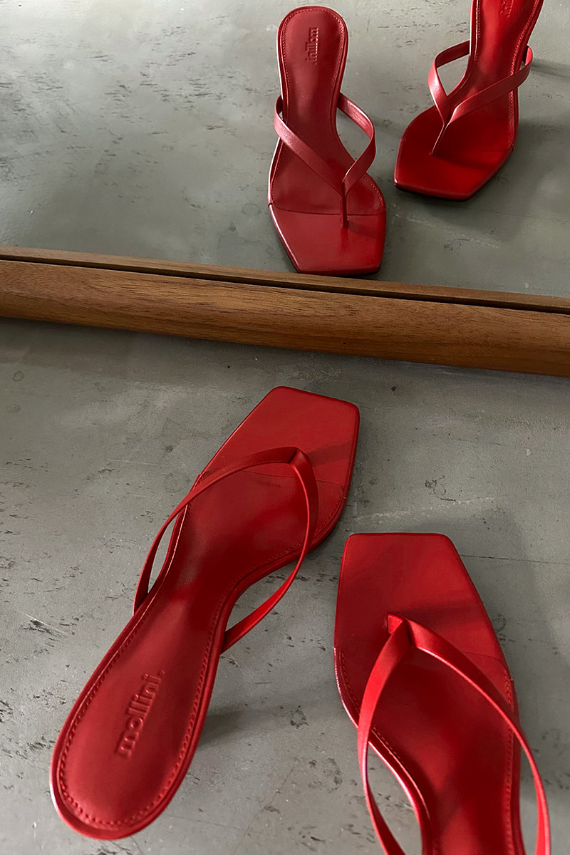 華奢なストラップとすっきりとしたスクエアトゥがトレンド間のあるモードな印象をプラスします。