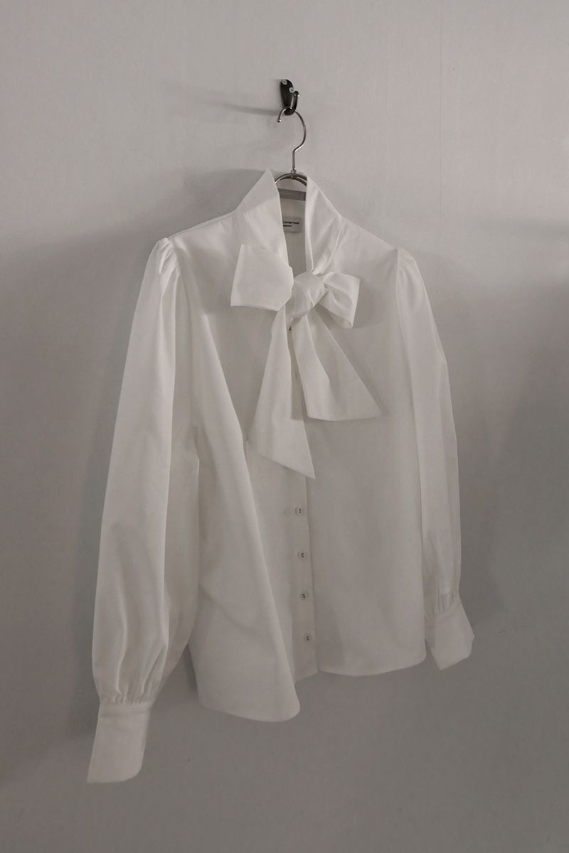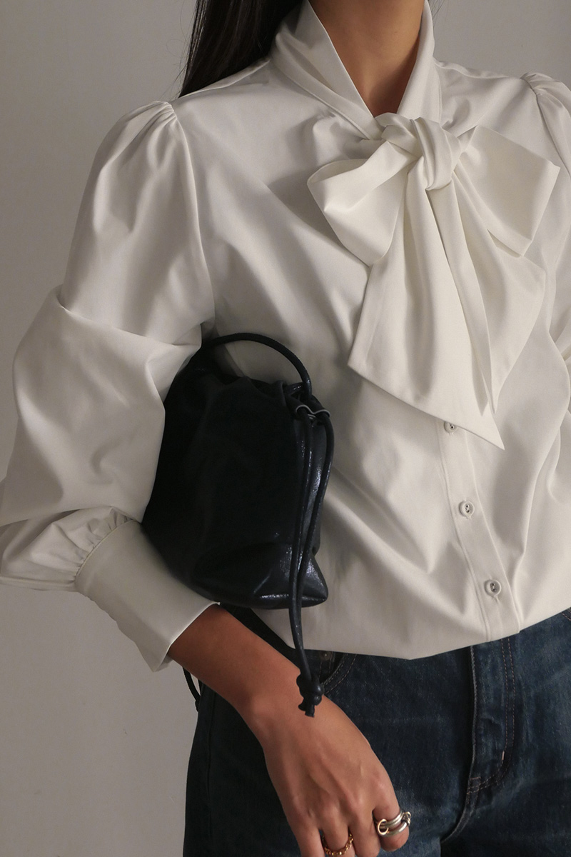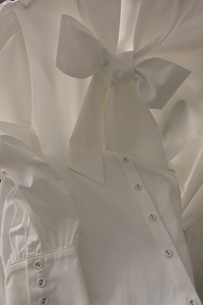 胸元のリボンで華やかさがありながら滑らかなマットな質感が光沢感を抑え、落ち着きのあるバランスのとれた一着。